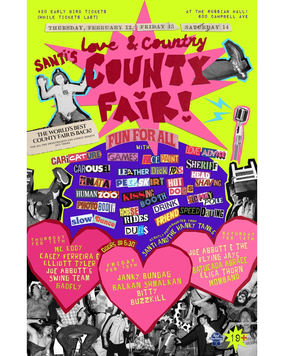 I pay a ticket to find some needles in a haystack and win a Pabst Beer 45” record. I watch some folks reach into their paper bag prizes to find that they’ve won a couple of cigarettes. There is a ring toss game over whiskey bottles, throw the toilet paper into the toilet bowl and toss a bean-bag dick onto a man form. Extra points if you can get it into the tiny heart hole. There is a jail, and a handsome Sheriff who seems to be having a great time tossing the consenting young women, who also seem to be having a great time, into the cell.